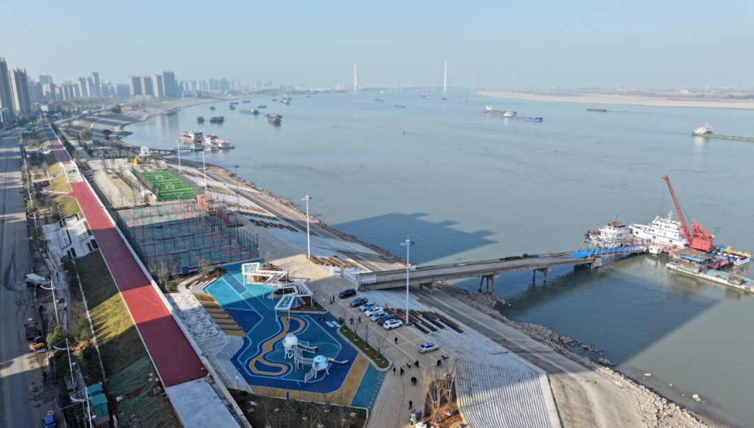 12月15日,长江国家文化公园(九江城区段)三期项目现场,长江大道以东项目建设热火朝天,长江大道以西项目基本完成,工人正在拆除施工围挡,不少市民来到崭新的公园里观长江。该项目滨江段建设采取分段实施的方式,不仅提升了建设效率,也让市民在建设过程中逐步享受其设施,大大增强了参与感和获得感。