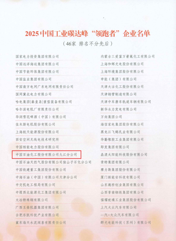 近日,在第四届中国工业碳达峰论坛上,九江石化获评2025中国工业碳达峰“领跑者”企业,成为全国46家入选企业之一。