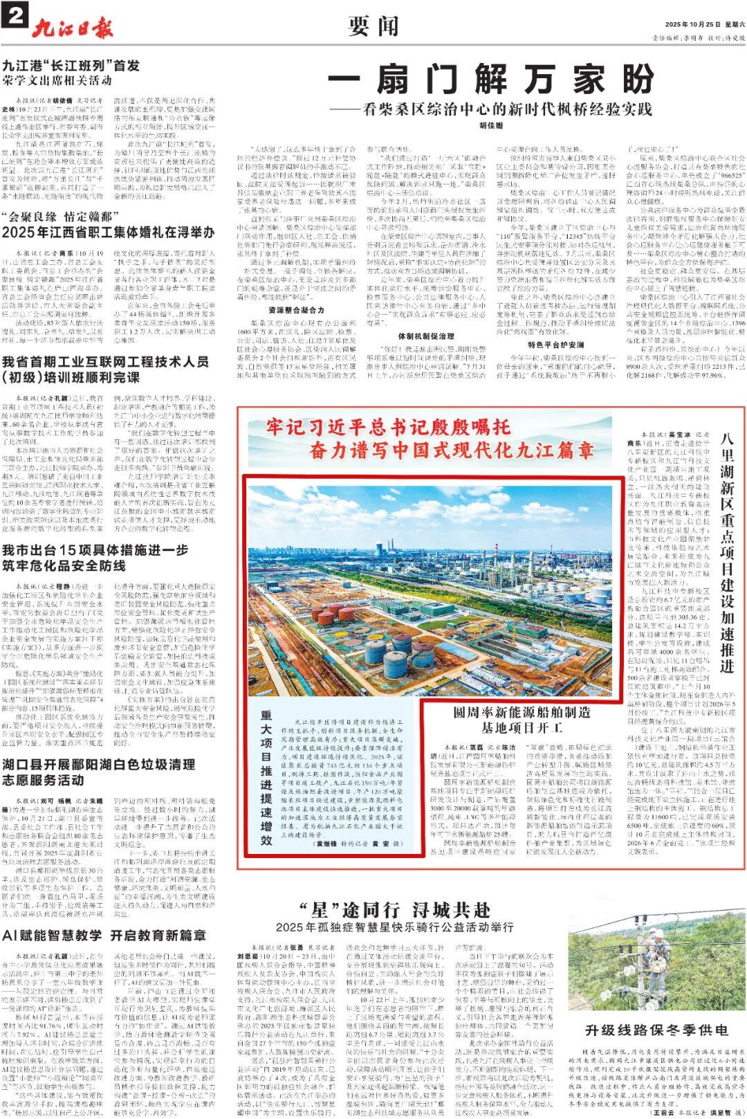 九江经开区将项目建设作为经济工作的主抓手,创新项目服务机制,全生命周期管理高效有序;重大项目集群突破,产业发展能级持续提升;要素保障精准有力,项目建设环境持续优化。2025年,该区聚焦总投资745亿元的134个重点项目,倒排工期、挂图作战,恒阳食品产业园等项目竣工投产,九江石化150万吨/年芳烃及炼油配套改造项目、年产120万吨聚酯长丝项目快速建设,重塑能源氢燃料电池项目主体建设快速推进,一批重大项目的加速落地为工业经济高质量发展夯实根基。图为航拍九江石化产业园大干快上的建设场景。