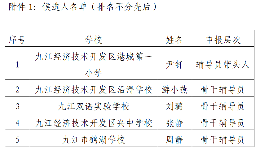 根据共青团九江市委、九江市教育局、九江市少工委《关于开展九江市第二届少先队辅导员带头人和骨干辅导员评审工作的通知》(九团联发〔2025〕7号)要求,经区团工委、社会发展局教育部门逐级评审,确定“九江市辅导员带头人”候选人1名和“九江市骨干辅导员”候选人4名,现对候选人名单进行公示,具体名单见附件1。