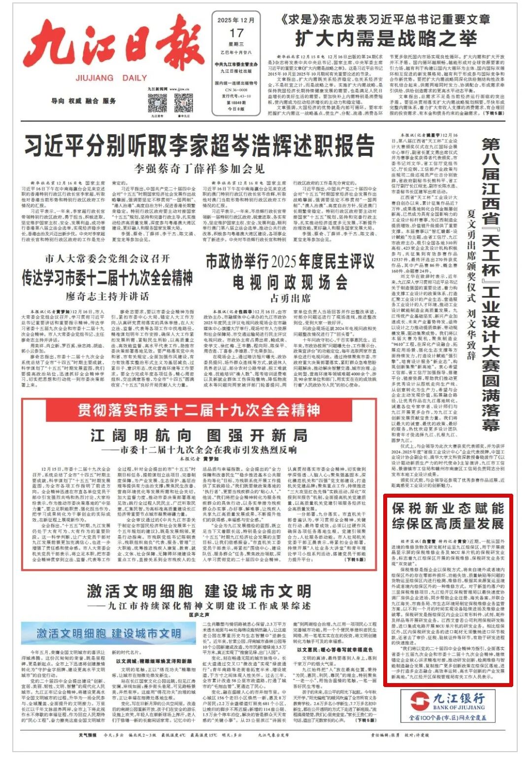 “我们将以党的二十届四中全会精神为指引,全面落实省委十五届九次全会和市委十二届十九次全会精神,继续锚定企业核心诉求精准对接,推动研发创新、检测维修与智能制造融合发展,复制推广更多创新政策在综保区落地,进一步打造多业态融合、高效率运转、高水平创新的产业发展新高地。”九江经开区保税管理局有关工作人员表示。